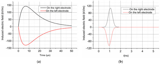 In order to show the time domain response of the sensor under pulsed current, a double exponential pulse current (I(t) = I0k(e−αt − e−βt), α = 7.714 × 104, β = 2.489 × 105, k = 2.33, I0 = 100 A) with wave front time Tf = 5.55 µs and duration time Td = 21.12 µs, and a Gaussian pulse current (I(t) = I0exp(−4π(t − t0)2/τ2), τ = 1 ns, I0 = 100 A) with rise time Tf = 1.0 ns and pulse width Td =1 ns are applied to the current-carrying wire. The induced electric field on the left and right modulation electrode are detected by using the electric field probe. The results are shown in Figure 7a,b, respectively. From Figure 7a, the front and duration time of the detected exponential pulse current waveform on the right and left electrode are 4.90 μs/21.83 μs and 4.88 μs/22.42 μs, respectively. From Figure 7b, the rise time and pulse width of the detected Gaussian pulse current on the right and left electrode are 0.8 ns/1.0 ns and 0.9 ns/1.1 ns, respectively. As a result, the detected induced electric field on the electrode agrees well with the applied pulsed current. Besides, directions of detected pulsed electric field on the right and left electrode are reverse, which is consistent with the theoretical analysis results.