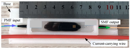 Figure 9 shows the photograph of a packaged integrated optics electric current sensor. As can be seen, the size of the packaged sensor is 78 mm × 15 mm × 10 mm. Moreover, in order to easily fix the current-carrying wire and to ensure the distance between the current wire and the loop-antenna is 10 cm in practical application, an insulated base with a groove has been fabricated and used.