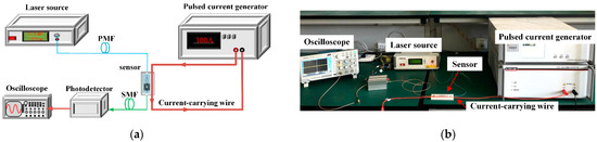 From Figure 10a, the current-carrying wire is connected with the input and output port of the pulsed current generator (LSG-506 CB) to generate the 8/20 μs standard lightning current from 50 A to 3300 A. The current-carrying wire is embedded into the groove of the sensor base. The distance between the sensor and the current-carrying wire is 10 mm. The tunable laser with an output optical power of 10 dBm, tunable wavelength range from 1530 nm to 1565 nm, and channel spacing of 0.4 nm is connected with the sensor input port by the PMF. The output wavelength of the laser source is tuned to ensure the sensor works at the linear area of the transmission curve. The output optical power of the sensor is transmitted to the PD with a bandwidth of 100 MHz to convert into electrical. The oscilloscope with a sampling rate of 2 GS/s and bandwidth of 200 MHz (Tektronix MDO3024) is used to extract the waveform of the measured pulsed current.