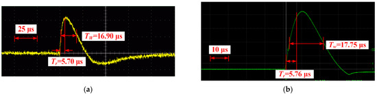 As an example, under the pulsed current of 2000 A, the sensor detected pulsed current waveforms are shown in Figure 11a. However, for comparison, the pulsed current is simultaneously measured by using the standard Pearson CT. From Figure 11a,b, the rise time, Tr, and pulse width, Tw, of the detected pulsed current waveforms using the proposed sensor and the Pearson CT are 5.70/16.90 μs and 5.76/17.75 μs, respectively. According to the standard of electromagnetic compatibility testing and measurement techniques surge immunity test (GB/T 17626.5-2019/IEC 61000-4-5: 2014), the front time Tf = 1.25 × Tr and duration time Td = 1.18 × Tw are 7.13/19.94 μs and 7.21/20.97 μs, respectively.