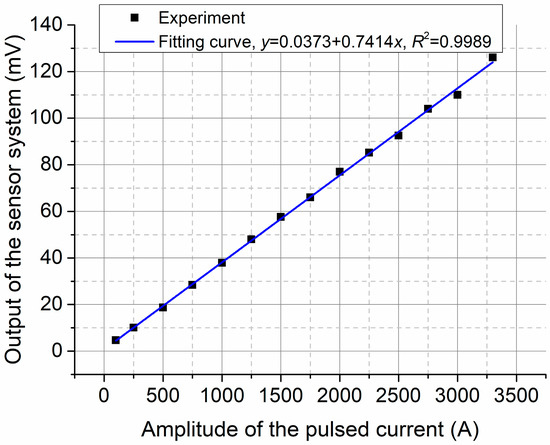 In addition, in order to demonstrate the input/output characteristics of the sensor, with the output pulsed current changed from 100 A to 3300 A by a step of 250 A, the amplitudes of the sensor system output signals are measured and shown in Figure 12. A linear fitting curve y = 0.0373 + 0.7414x is used to stand for the relationship between the input pulsed current and the output of the sensor system. The linear correlation coefficient of 0.9989 reveals that the sensor has a better linear characteristic. Moreover, in the experiment, considering the noise floor of the sensor system is about 1.6 mV, the minimum detectable current of the sensor system is about 66 A under the condition of the signal to noise ratio (SNR) being 6 dB.