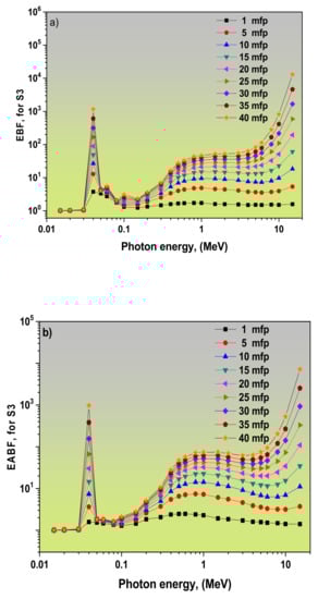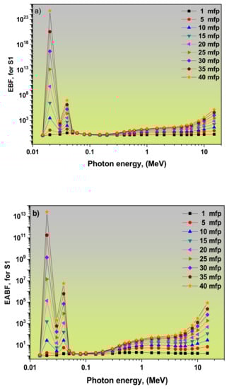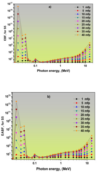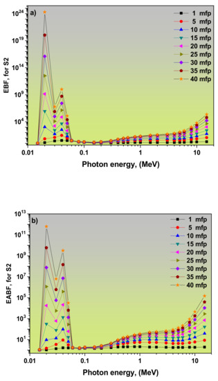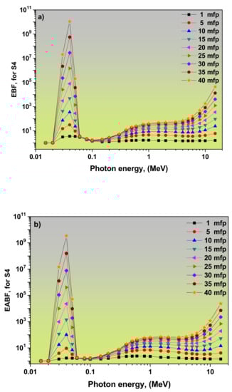 3.2. Dependence of EBF and EABF Values on the Photon Energy