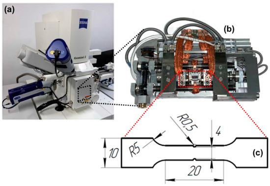 (a) ZEISS Gemini SEM 450 scanning electron microscope used (b) and the in situ tensile model. (c) Geometry of the in situ specimens with notches for the stress concentration, where all the dimensions are in mm.