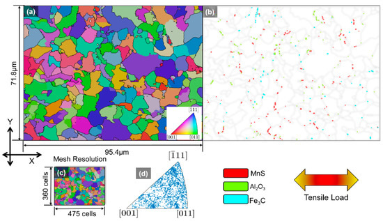 Multi-phase steel specimen. (a) IPF for ferrite matrix with BCC crystal structure, with different colors showing different crystallographic orientations. (b) Three types of inclusions spread all over the ferrite matrix and (c) the mesh resolution showing the grid size for calculation points. (d) IPF figure showing orientations of ferrite grain orientations with reference directions.