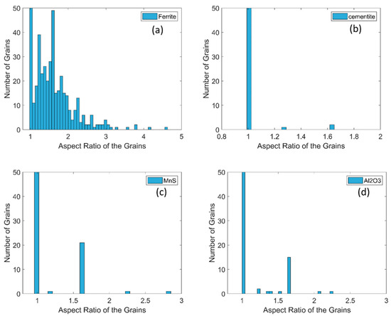 Distribution of aspect ratios of (a) ferrite grains, which are relatively larger and have a wider spread; (b) cementite inclusions, which are close to 1, with few inclusions at 1.3 and 1.7; (c) MnS inclusions are also usually round, with a few with a spread of 2.8; (d) Al2O3 inclusions are also usually round with an aspect ratio of 1, with some inclusions reaching up to 2.3.