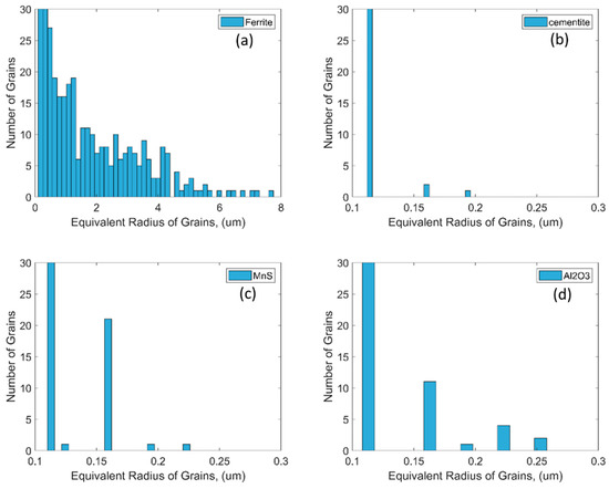 The grain size in Figure 4 is measured in terms of the mean sphere diameter. A significant number of ferrite grains in the selected area for EBSD analysis are below 4 µm, as observed in Figure 4a, and some grains are larger than 6 µm. As shown in Figure 4b–d, the inclusions are comparatively very small. Most inclusions are around 0.1 µm in size, whereas very few are larger than 0.2 µm. Even smaller inclusions may be present within the microstructure but were not detected due to the selected magnification and EBSD measurement step size. This lack of smaller inclusions negligibly alters the material chemistry or local phase distribution and hence is assumed to have almost no effect on the simulation results.