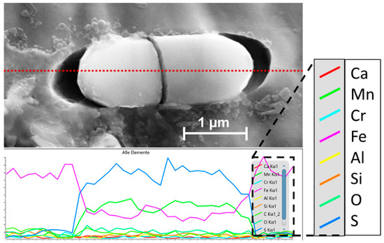 Elemental analysis of the modified 16MnCrS5 steel specimen using EDS to identify the inclusions (the red dotted line represents the line of measurement). The inclusion shows a major concentration of Mn and S; therefore, it is classified as an MnS inclusion.