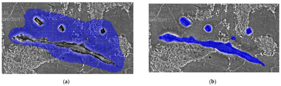 The digital image correlation software VEDDAC from Chemnitzer Werkstoffmechanik GmbH was used to process the captured image series. When processing the images, images with strong contrast or sharpness fluctuations were removed from the calculations, and the final set contained images. Two calculation areas were selected during DIC. The first calculation area is shown in Figure 6a, which consists of the matrix around the inclusions and the cavities. The second calculation is the inclusion area and cavities around it, as shown in Figure 6b. The optimal grid sizes for a particular series of images were 9 × 9 pixels (coarse) for the matrix and 5 × 5 pixels for the inclusion (fine). More information about the local strain measurement methodology is provided in Appendix B.