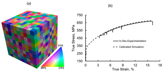 Readers are encouraged to read the pioneering work by the developers of DAMASK for further details and understanding of the model [33,34,48,49]. For instance, a strategy was published recently by Qayyum et al. [50] by choosing an optimal RVE that behaves isotopically yet is small enough to produce fast results for the calibration of the material model parameters of single-phase materials. The strategy comprises a 10 × 10 × 10 size RVE containing 1000 grains, where each point represents a different grain. The RVE adopted from that published methodology is shown in Figure 7a. This RVE was used to calibrate the fitting parameters in the material model by comparing simulation outcomes with the experimental observations, and the results are shown in Figure 7b.
