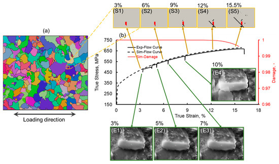 (a) RVE chosen to run full phase simulations in IPF colors; yellow box represents one of the crack initiation zones. (b) Outcome of the simulation flow curve in comparison with the in situ experimental test results, showing a good match; the dips in the experimental results are the points where the test was stopped to take local pictures of the inclusions for later DIC. E1–E4 show the damage evolution around an MnS inclusion, S1–S5 inset figures show the damage evolution around a comparable MnS inclusion during numerical simulation.