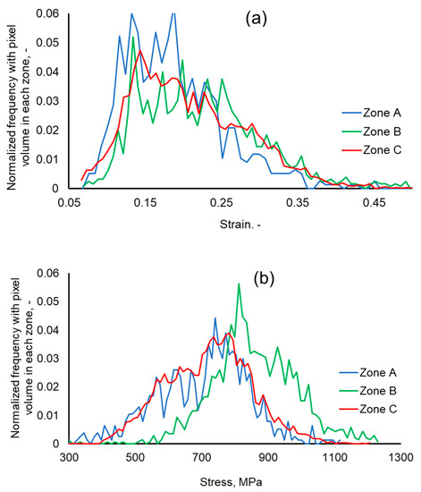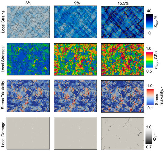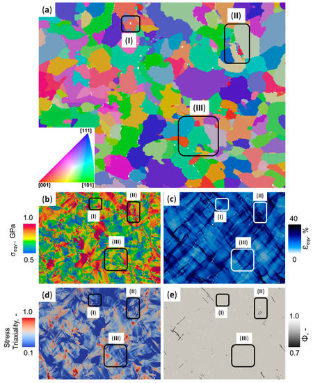 The DAMASK framework is designed to get all the inputs in the form of specifically structured text files with a complete microstructural description of RVE with geometrical details, material behavior attributes, and boundary values. Elastic and plastic phase parameters for ferrite and only elastic parameters of all the inclusions are defined to observe the micromechanical deformation of ferrite caused by stiffness degradation. Ductile damage criteria have been incorporated in the ferrite matrix as well. The RVE generated by using the EBSD data shown in Figure 2 was subjected to quasi-static tensile load with a strain rate of 10−3 s−1 in the x-direction.
