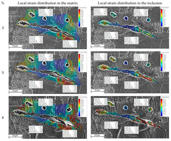As a result of the tests, the meso deformation in the long inclusion in the tensile specimen was calculated. The results of meso-scale deformation are presented in Table A1.