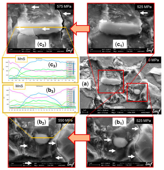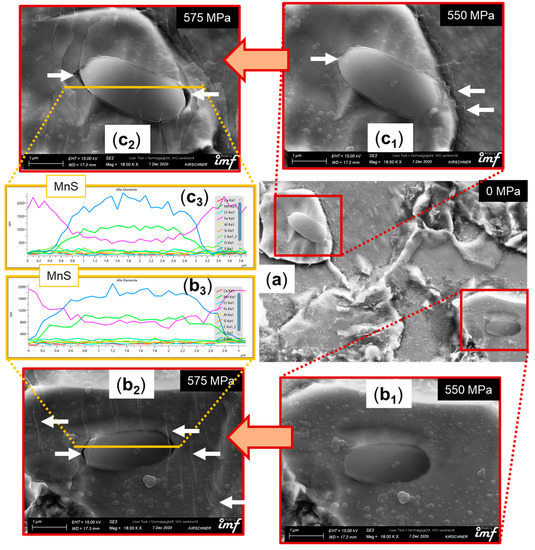 During the in situ tensile tests, a large, elongated sulfide inclusion (MnS) was analyzed. The inclusion, along with the chemical analysis confirming it to be MnS, is shown in Table 2. The length of the inclusion together with the cavity is about 42.5 μm. The elongated inclusion aligned with the tensile loading axis (horizontal to the shown micrograph) was expected to be prone to severe fracture and was therefore of great interest.