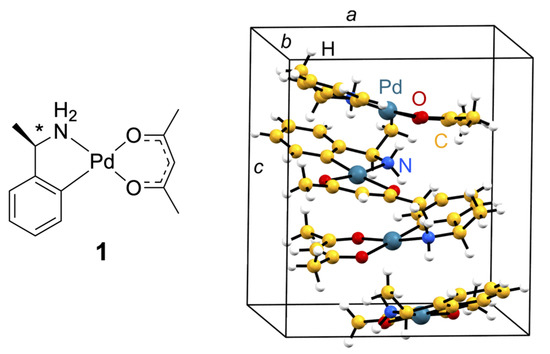- Calmuschi, B.; Englert, U. (S)-(Acetylacetonato-κ2O,O)[2-(1-aminoethyl)phenyl-κ2C1,N]palladium(II). Acta Crystallogr. Sect. E 2005, 61, m164–m165. [Google Scholar] [CrossRef]