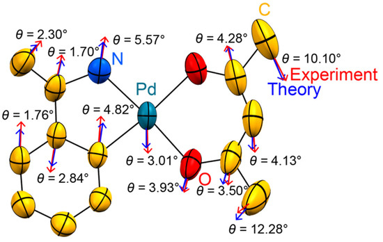 We have previously shown [30] that ADPs derived via the harmonic approximation often agree well with experimentally established displacement parameters with respect to their directionality. This is also true for our benchmark compound 1: the angles between the theoretical and experimental main axes of the ADPs are small and remain nearly constant throughout the entire temperature range under investigation, with deviations of only a few degrees. As an example, this good match is shown in Figure 2 for T = 130 K.
