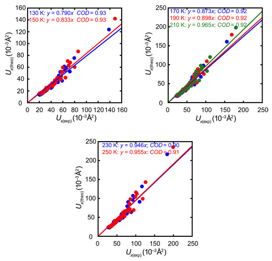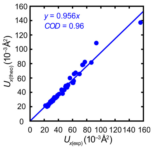 Overall, Figure 3 reveals that the coefficient of determination (COD) and amplitude are acceptable for the entire temperature range under investigation, with a slightly lower slope for the lowest temperatures. It should be noted that in this case and the following scatter plots, with the exception of Figure 4, the least-squares-derived standard uncertainties of the experimental values are too small to be visualized. Obviously, such standard uncertainties can only represent the lower limit, and systematic errors in ADPs are usually much larger.