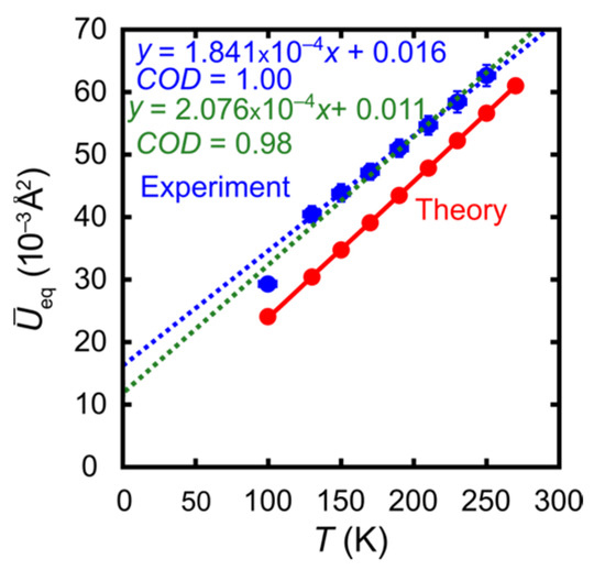 However, a common phenomenon concerning the harmonic approximation is obvious in this temperature-resolved study. Overall, the amplitude of motion is too small in the harmonic approximation, with all slopes in Figure 3 smaller than unity. Similar observations in other studies [2,34,35] confirm that the harmonic approximation generally underestimates the ADPs for at least two reasons: higher temperature leads to thermal expansion, and anharmonic contributions to the ADPs are neglected.