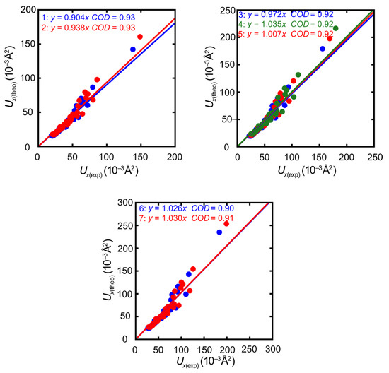 In this sense, we tested the correlations between theory and experiment assuming such a simple constant offset, e.g., ADPs from harmonic theory at 170 K versus ADPs derived from a diffraction experiment at 150 K. The results are depicted in Figure 6.