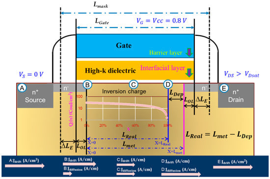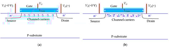 In conventional device models for metal-oxide-semiconductor field-effect transistors (MOSFETs), the drive current (ON current) [1,2] mainly considers the moving carriers with the drift effect, as shown in Figure 1a. Due to this simple assumption, the pseudo-ideal device models can easily and quickly be assigned to the design houses. For the long-channel devices, this strategy is commercially acceptable. As the channel length of a MOSFET decreases, the saturation current of MOSFETs increases with the increase in the drain voltage or decrease in the channel length, which is known as channel length modulation [3,4,5] or velocity overshoot [6,7,8,9]. However, the proposed conduction mechanisms do not seem to entirely fit the physically measured current-voltage results. The device models in semiconductor foundries usually assist in making an empirical adjustment to compensate for this drawback, but have no physical meaning. Previously, a new concept incorporating the diffusion effect at each channel point was proposed due to the gradient of inversion charge density, especially near the pinch-off point [10]. At this pinch-off point, the inversion charge density approaches zero, indicating zero drift current, but the real drive current is not zero.
