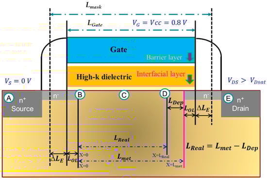 Based on the previous work [11], five checking points A, B, C, D, and E, as shown in Figure 3, were utilized to expose the carrier mobility μ(x) and the drift current (see Figure 3), where μ(x) was the function of the position x in the surface channel and the range of position x was from point B to point D. However, it was not enough to describe the whole behavior of an equivalent mobility μeq correlated to VDS, VGS, and Lmask, independent of position x.