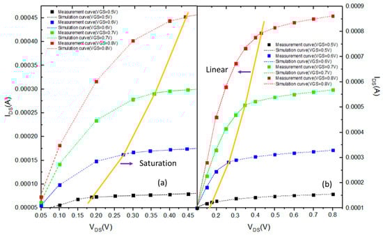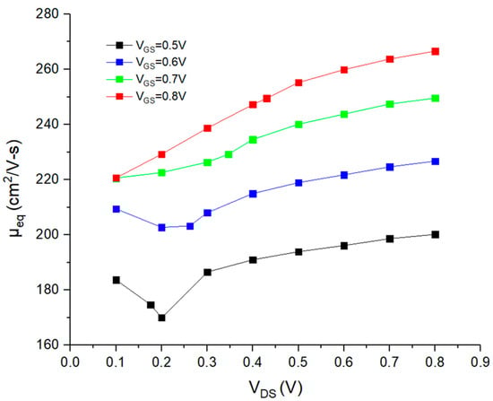 We incorporated various conditions with VDS, VGS, and Lmask to reasonably describe the whole drive current and fit μeq in Equations (1)–(6),