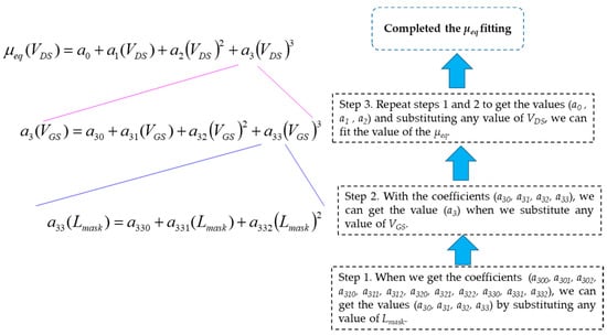 First of all, μeq is written as a function of VDS in terms of different VGS at a fixed Lmask, which is described by a third-order polynomial using Taylor’s expansion in Equation (7), where Xi is the coefficient of the ith polynomial with i = 0, 1, 2, 3.