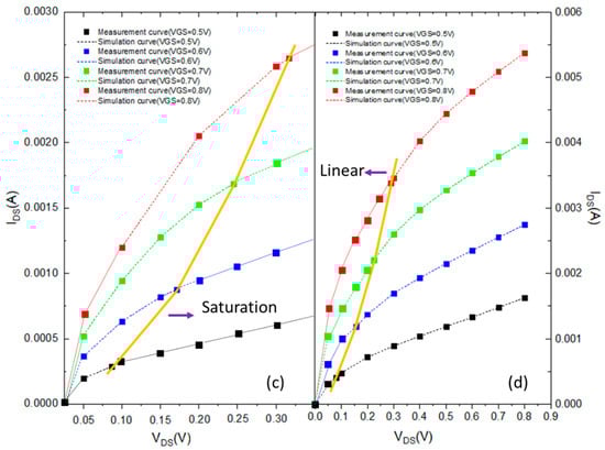 Following the previous flow charts to obtain the coefficients of Xi, Xij, and Xijk, the μeq(VDS, VGS, Lmask) at a variable perturbation could be effectively and meaningfully extracted. The equivalent mobility was immediately substituted into Equation (5) to simulate the corresponding drive current. The simulated and experimental results of curves I–V with long-and-short channel devices are shown in Figure 7a–d.