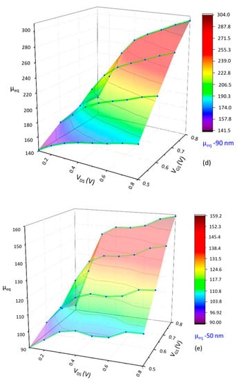 For precise observation of the contribution of μeq correlated to VDS, VGS, and Lmask, one three-dimensional (3D) plot was established, as shown in Figure 8, incorporating all of these extracted data linked as lines and extending these lines as a continuous plane.