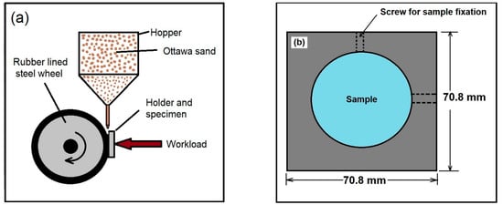 Schematic representation of (a) the sand/rubber apparatus for the wear tests and (b) the sample’s holder [4].