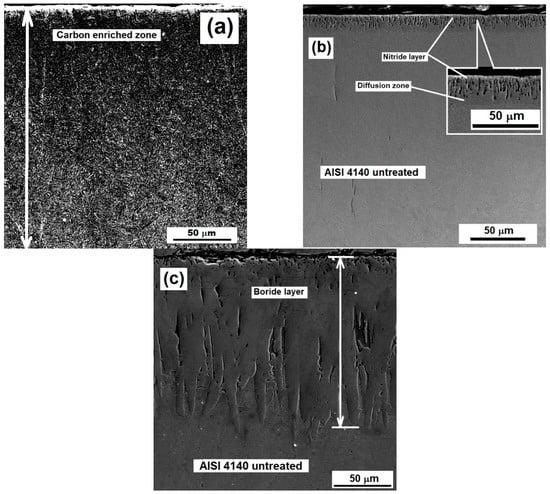 SEM images of the cross-sections of the samples exposed to (a) carburizing, (b) nitriding and (c) boriding.