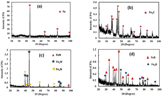 The XRD patterns were compared with data cards 98-002-9341 for Fe3C (carburized samples), 98-004-1258, 98-002-0390, and 98-002-4650 for FeN, Fe2N, and Fe3N, respectively (nitrided samples), and 00-036-1332 and 00-032-0463, which represent the XRD patterns of Fe2B, FeB, respectively (borided samples). In the XRD pattern of the carburized samples (Figure 3b), strong picks indicated the presence of Fe3C (i.e., cementite), which was the hardest phase of the carbon–iron alloy. The presence of that phase at the surface of the AISI 4140 steel indicated the apparent effect of the carburizing process on the chemical composition of the treated steel. Likewise, the XRD pattern of the nitrided sample (Figure 3c) showed strong picks along the 2θ scale, indicating the presence of FeN, Fe2N, and Fe3N. The presence of these compounds at the surface of the AISI 4140 indicated the apparent influence of the nitriding process on the chemical composition of the steel. Finally, in the XRD pattern of the sample exposed to boriding (Figure 3d), we observed strong picks that indicated not only the presence of the Fe2B phase, but also the presence of FeB at the surface of the AISI 4140 steel. As was expected, the untreated sample only shows the presence of iron, which is the element with the main content in the AISI 4140 steel (Figure 3a).