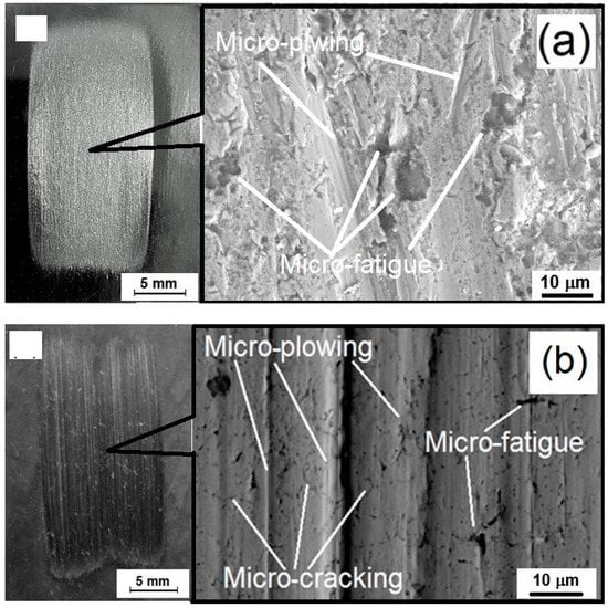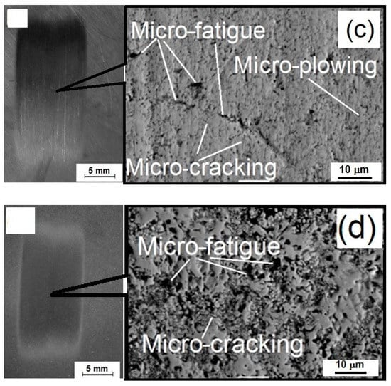 Different signs of wear can be seen in Figure 4. In the case of carburizing (Figure 4b), the sample exhibited the most significant damage as a function of the wear scar. The signs present during testing were micro-cracking, micro-plowing, micro-fatigue, and micro-cutting. However, micro-plowing and micro-cracking appeared to be the signs exhibited with the most frequency; therefore, micro-plowing and micro-cracking may be the precursors for wear in the carburized samples.