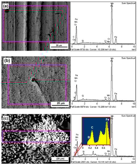 The EDS analysis of the wear tracks of the three hardened surfaces is shown in Figure 5. The carburized, nitrided, and borided samples show the presence of Fe, Cr, Mn, Si, and O. The first four elements are present in the steel alloy, but the presence of oxygen suggests the formation of oxides that could have contributed to the wear of the surface. However, the Si present in the EDS analysis reflected a higher content than that reported in the steel alloy. That result was likely due to the chemical composition of the abrasive agent used during the wear tests.