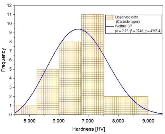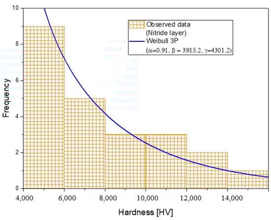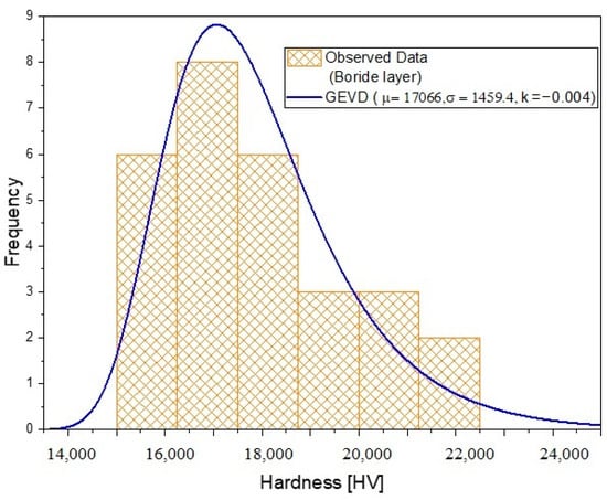 A microhardness profile was performed for each hard layer (i.e., boride, nitride, and carbide) formed on AISI 4140. A histogram was plotted using this information, and its corresponding probability density function that best fit was drawn as well (See Figure 8, Figure 9 and Figure 10). To select the probability density function that best fit, the generalized extreme value distribution (GEVD), the Weibull 3P distribution, the Fréchet 3P distribution, and the log-normal 3P distribution were compared using the Kolmogorov–Smirnov test [31]. The results obtained with this analysis are shown in Table 9. The best-fit distribution for micro-hardness tested for boride layers was the GEVD, and for the nitride layer and carbide layer, Weibull 3P results were the best choice.