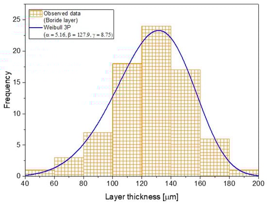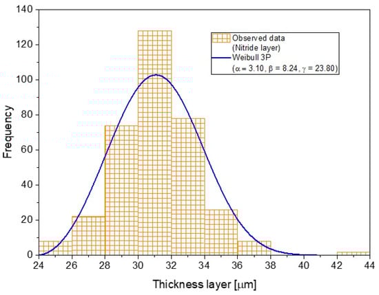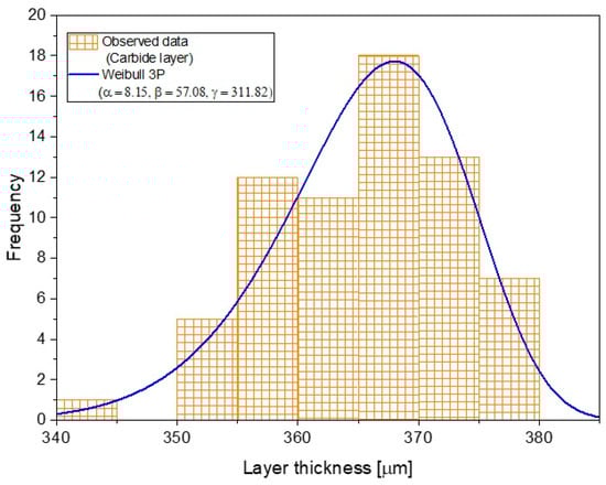 Another key parameter to study was the layer thickness, as this parameter would indicate the metal’s lifetime and its application. Histograms for each layer thickness were also plotted and fitted to find the probability density function representing the observations data. Table 10 shows the results obtained after fitting the observation data to the functions provided in Table 9 using the Kolmogorov–Smirnov test. In addition, Figure 11, Figure 12 and Figure 13 show the observed histogram and its corresponding best-fit probability density function. Weibull 3P was the best choice to represent the layer thickness in the three cases. Furthermore, as Weibull 3P is a variation of the GEVD but shifted γ along the x-axis, it could better represent the information obtained in the experiment.