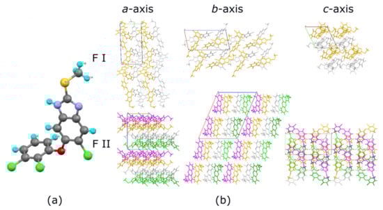 Crystal structures of a triclabendazole molecule. (a) Molecular structure of triclabendazole, where the cyan, gray, green, red, purple, and yellow-colored spheres represent H, C, Cl, O, N, and S atoms, respectively. (b) TCBZ crystal structures of forms I and II with molecular arrangements in the a-axis, b-axis, and c-axis, where molecules were colored by the operation of symmetry.