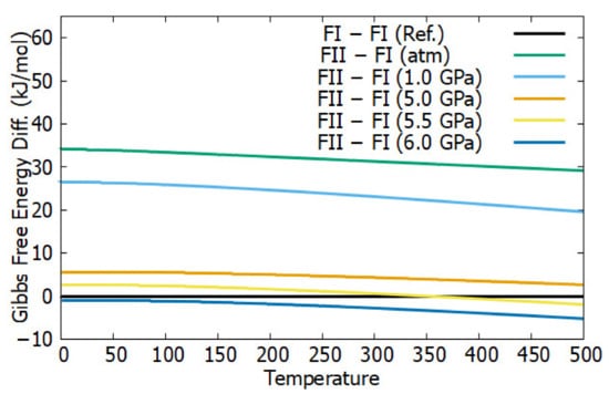 From our results of the Gibbs free energy difference, we can observe pressure-induced phase transition between form I and form II of TCBZ. At 0 K and atmospheric pressure, the difference of Gibbs free energy between form I and form II is positive which means form II is less stable than form I. Moreover, the Gibbs free energy difference at these conditions is about 35 kJ/mol, which is not so high. We can achieve this gap of Gibbs free energy by means of increasing pressures. We found phase transformation at a pressure and temperature of 5.5 GPa and ≈350 K, respectively. From 0 Gpa up to 5 Gpa, form II is less stable than form I in the temperature range studied (0–500 K). However, at 6 GPa, form I becomes less stable than form II in the temperature range studied. Moreover, at an external pressure of 5.5 GPa, form II is less stable than form I at a temperature less than ≈350 K, however, at a temperature higher than ≈350 K, form I is less stable than form II (Figure 3). In addition, we also calculated Gibbs free energies at 7 GPa and 11 GPa, where form II is more stable than form I in the temperature range studied; see Figure S3. The computation of phase transformation at different temperatures and pressures enabled us to make a full phase diagram with temperature and pressure ranges from 0 to 500 K and 1 atm to 11 GPa, respectively. Moreover, TCBZ has two tautomers originally [12] but we considered only one tautomer for TCBZ form II. This assumption may affect our results slightly [30].