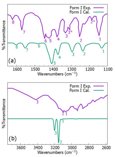 FT-IR spectra of triclabendazole form I at frequencies (a) from 1100 cm−1 to 1600 cm−1 and (b) from 2600 cm−1 to 3600 cm−1. The purple curve represents experimental (Exp.) results [12] which were conducted at atmospheric pressure and room temperature. The green curve represents calculated (Cal.) results, which were obtained at atmospheric pressure and a temperature of 0 K.