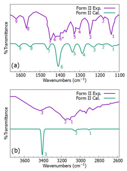 FT-IR spectra of triclabendazole form II at frequencies (a) from 1100 cm−1 to 1600 cm−1 and (b) from 2600 cm−1 to 3600 cm−1. The purple curve represents experimental (Exp.) results [12] which were conducted at atmospheric pressure and room temperature. The green curve represents calculated (Cal.) results, which were obtained at atmospheric pressure and a temperature of 0 K.