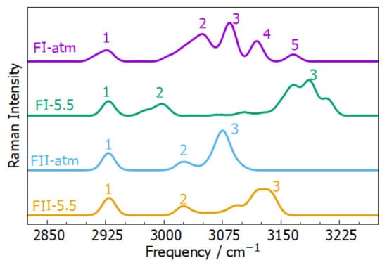 Calculated Raman spectra of TCBZ are given in Figure 6. As we were not able to find experimental Raman spectra for TCBZ forms I and II, here we provide a comparison of Raman spectra computed for the two forms at different pressures. At atmospheric pressure, form I with purple color curve and form II with blue color curve show five and three characteristic peaks, respectively. Raman spectra under the pressure of 5.5 GPa for forms I and II are presented with green and yellow colors, respectively. At 5.5 GPa pressure, form I showed a reduction in the number of peaks. At atmospheric pressure, form I showed five peaks and at 5.5 GPa, it showed three peaks only, with a broadened peak (labeled with “3”). As both forms showed changes in Raman spectra under high pressures, this means there is an effect of pressure on the crystal structures of both forms.