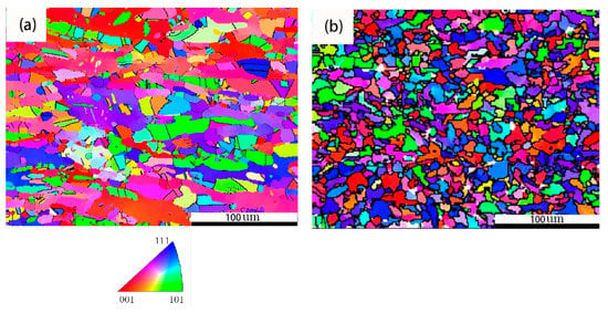 The 2205 duplex stainless steel and Q345 carbon steel used in this paper are from 16 mm thick steel plates, and their chemical compositions are displayed in Table 1. The initial microstructures of 2205 duplex stainless steel and Q345 carbon steel are shown in Figure 1. The Q345 carbon steel was composed of uniform and fine grains with sizes of 10 μm. The grains of 2205 duplex stainless steel are elongated with a width of 30 μm.