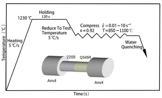 The experiment was carried out on a Gleeble-3800 thermal simulator. The sample was a cylinder with a diameter of 10 mm and a height of 15 mm. The end face of the cylinder was ground by a surface grinder to ensure the flatness of the end face so that there was no gap between the two cylinder ends when they contact. When clamping the sample, graphite lubricating oil and tantalum pad was applied between the end face and the indenter, so as to reduce the friction between the indenter and the specimen, as shown in Figure 2. Before the experiment, two K-type stainless steel were welded to 2205 duplex stainless steel near the intermediate interface. After clamping, the sample chamber was vacuumed to make the vacuum degree lower than 1.0 × 10−1 Pa, and then the operation program was started. The sample was heated to 1230 °C at a heating rate of 5 °C/s for 2 min to homogenize the structure. Next, at a temperature drop rate of 5 °C/s, the sample was reduced to the corresponding deformation temperature, after which undergoes thermal compression composite deformation. The deformation temperature (T) was 850–1100 °C, with an interval of 50 °C. The deformation temperature compression rates were 0.01 s−1, 0.1 s−1, 1 s−1, and 10 s−1. Meanwhile, the true strain was 0.92. After the thermal compression composite was completed, it was water-cooled to retain the thermally deformed structure.