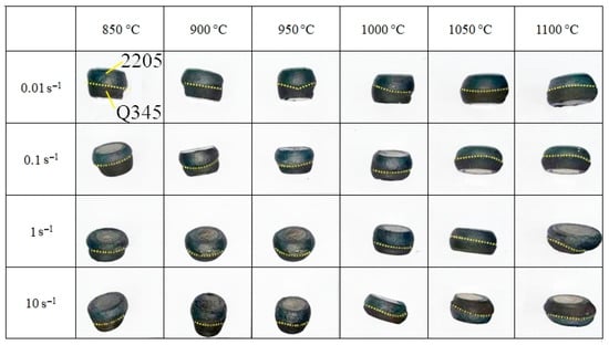 Figure 3 illustrates the macroscopic sample after 2205/Q345 thermal compression composite. From the analysis of different temperatures, it can be seen that the deformation behavior of the two samples at low temperatures (850–950 °C) is quite different. The deformation of Q345 is obviously greater than 2205. After reaching 1000 °C, the two materials increase with the temperature, and the deformation behavior tends to be similar. From the analysis of different deformation rates, it is obvious that as the deformation rate increases, the deformation of the material becomes more and more irregular, which is because the material does not have time to uniformly deform as the rate increases. At the same time, from Figure 3, the analysis demonstrates that when the deformation temperature is 1050 °C and the deformation rate is 1–10 s−1, the deformation behavior of 2205/Q345 is almost similar.
