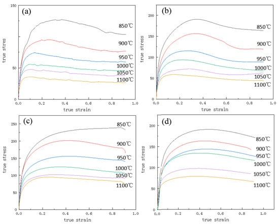 Figure 4 reveals the true stress–strain curve of the 2205/Q345 thermal compression composite test at the temperature, ranging from 850 °C to 1100 °C, and the strain rate of 0.01 s−1–10 s−1. From the 2205/Q345 thermal compression composite stress–strain curve, it is found that in the initial stage of compression composite deformation, the flow stress increases rapidly with the increase of strain, after which the flow stress starts to increase slowly until it reaches the peak. Subsequently, the flow stress tends to decrease or maintain a steady state. The deformation curves are in the form of dynamic recrystallization.