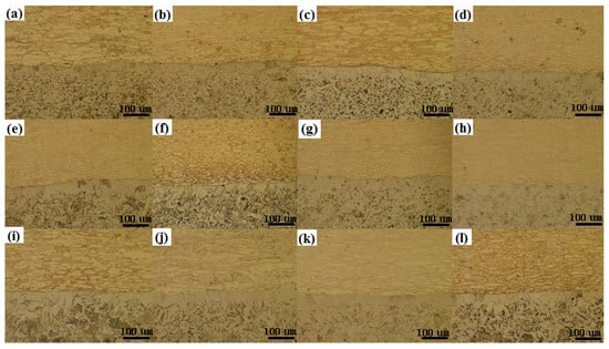 Microstructure of composite interface in large deformation area by optical microscope. (a) 850 °C, 0.01 s−1; (b) 850 °C, 0.1 s−1; (c) 850 °C, 1 s−1; (d) 850 °C, 10 s−1; (e) 1000 °C, 0.01 s−1; (f) 1000 °C, 0.1 s−1; (g) 1000 °C, 1 s−1; (h) 1000 °C, 10 s−1; (i) 1050 °C, 0.01 s−1; (j) 1050 °C, 0.1 s−1; (k) 1050 °C, 1 s−1; (l) 1050 °C, 10 s−1.