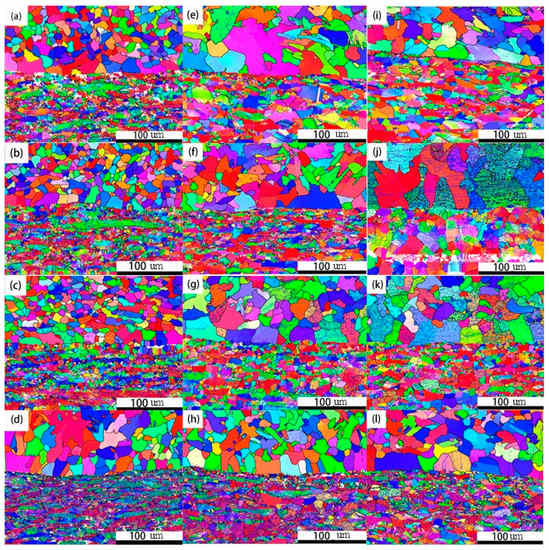 Composite interface IPF for 1000 times large deformation area (a) 850 °C, 0.01 s−1; (b) 850 °C, 0.1 s−1; (c) 850 °C, 1 s−1; (d) 850 °C, 10 s−1; (e) 1000 °C, 0.01 s−1; (f) 1000 °C, 0.1 s−1; (g) 1000 °C, 1 s−1; (h) 1000 °C, 10 s−1; (i) 1050 °C, 0.01 s−1; (j) 1050 °C, 0.1 s−1; (k) 1050 °C, 1 s−1; (l) 1050 °C, 10 s−1.