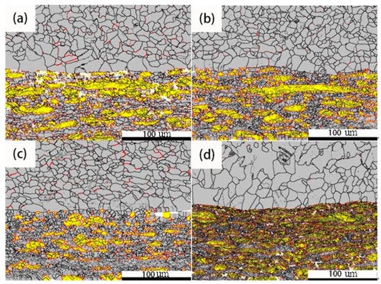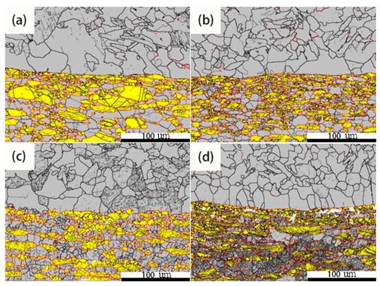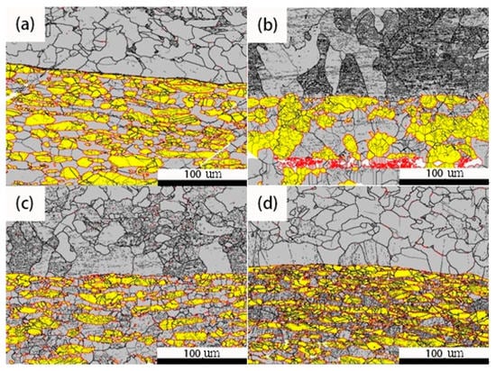 In the figure, gray marks the bcc structure, yellow stands for the austenite fcc structure, the red grain boundary represents the phase boundary, the black coarse grain boundary represents >15°, and the black fine grain boundary represents 2–15°. First, the upper layer Q345 is basically composed of a bcc structure. The phase boundary first decreases and then increases with the increase of the deformation rate at a strain rate of 0.01–1 s−1. The phase boundary is more obvious and uniform at 1 s−1. When the strain rate increases to 10 s−1 and the size of Q345 grain becomes larger, the analysis may be because the crystal is too late for dynamic recovery and recrystallization at high speed, resulting in coarse grains. By observing the lower layer 2205, it is discovered that at a strain rate of 0.01 s−1, the fcc austenite phase presents an elliptical shape. As the deformation rate increases to 0.1 s−1, the austenite phase shows a large block morphology and the local fine red phase boundary reduction. When the deformation rate increases to 1 s−1, the large austenite phase is squashed, indicating a tendency of fragmentation. At this time, the proportion of bcc and fcc is coordinated. When the deformation rate increases to 10 s−1, the austenite phase is severely elongated and deformed, and the morphology fragmentation becomes more obvious. From Figure 7, it is obvious that at 850 °C, as the strain rate increases, the black marked sub-grain boundaries (2–15°) gradually increase, from a local increase to the entire deformation zone.