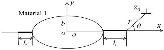 Consider a quasi-crystal piezoelectric bi-material that consists of two dissimilar transversely isotropic media with respect to the poling direction (-direction). It is assumed that the upper plane is material 1 and the lower plane is material 2. There are two asymmetrical interface cracks, given in Figure 1. Here, and denote the lengths of the major semi-axis and the minor semi-axis of the elliptical hole, respectively; and denote the lengths of the two cracks. A screw dislocation with Burgers vector , where the dislocation line perpendicular to the -plane is located at in material 1, where , stand for the displacement jump values of phonon field and phason field, respectively, means the electric-potential jump value [24].