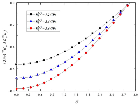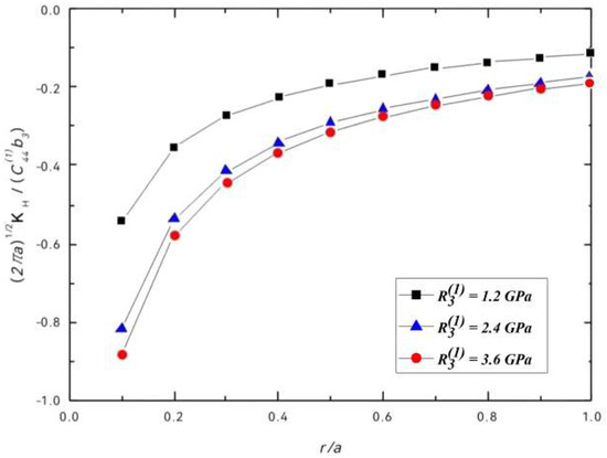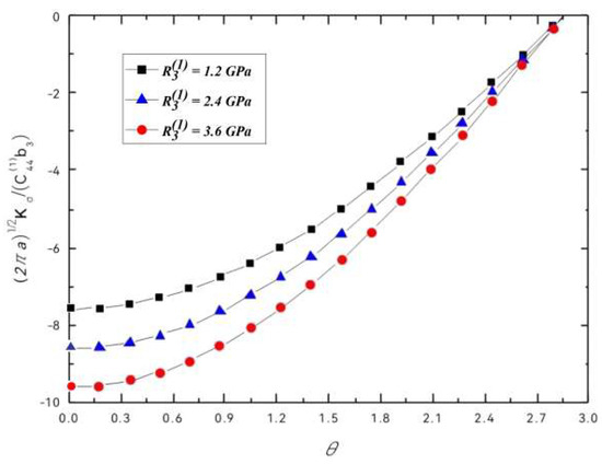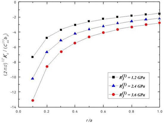 Figure 6 and Figure 7 show the variations of the normalized phonon and phason stress intensity factors with for different values of at , , , . We found that the SIFs are negative in this condition, which shows that screw dislocation can reduce the shielding effect. The shielding effect increases as the value of the coupling constants increases, but decreases as the value of increases.