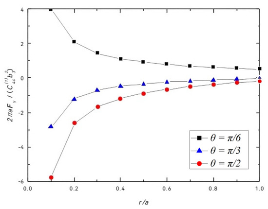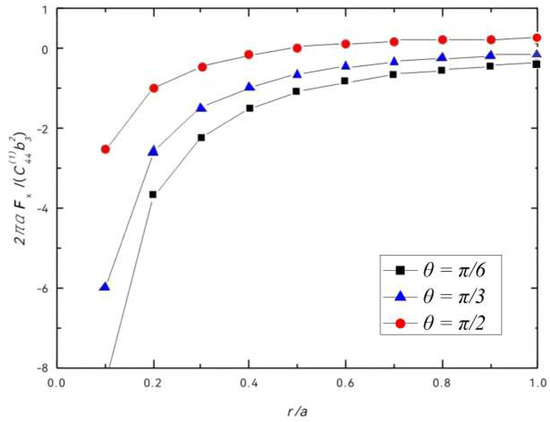 Figure 8 and Figure 9 give the relation between the normalized image force and for selected elevation angles θ. As shown in Figure 6, we found that the value of the normalized image force in the x-axis direction decreases with the increase in and increases with the increase in . The crack always attracts the dislocation in the x-axis direction. As shown in Figure 9, we found that whether the image force in the y-axis direction is attractive or repulsive is difficult to determine because it is affected by the position of the dislocation.